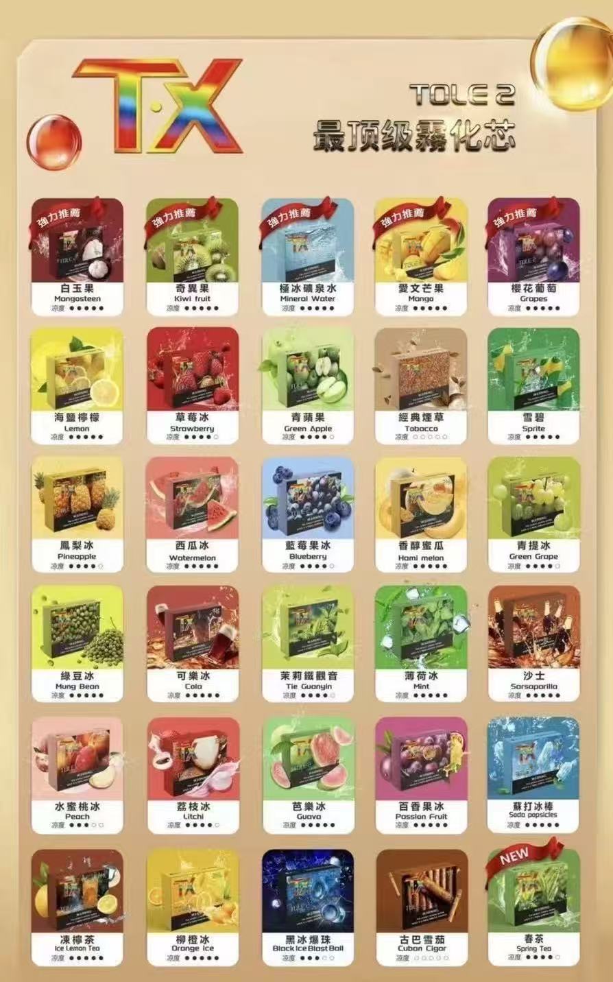白玉果(山竹) ,奇異果 ,極冰礦泉水 ,愛文芒果 ,櫻花葡萄 ,海鹽檸檬 ,草莓冰 ,青蘋果 ,經典煙草 ,雪碧 ,鳳梨冰 ,西瓜冰 ,藍莓冰 ,香醇蜜瓜 ,青提冰(青葡萄) ,綠豆冰 ,可樂冰 ,茉莉鐵觀音 ,薄荷冰 ,沙士 ,水蜜桃冰 ,荔枝冰 ,芭樂冰 ,百香果冰 ,蘇打冰棒 ,凍檸茶 ,柳橙冰 ,黑冰爆珠 ,古巴雪茄 ,春茶 |